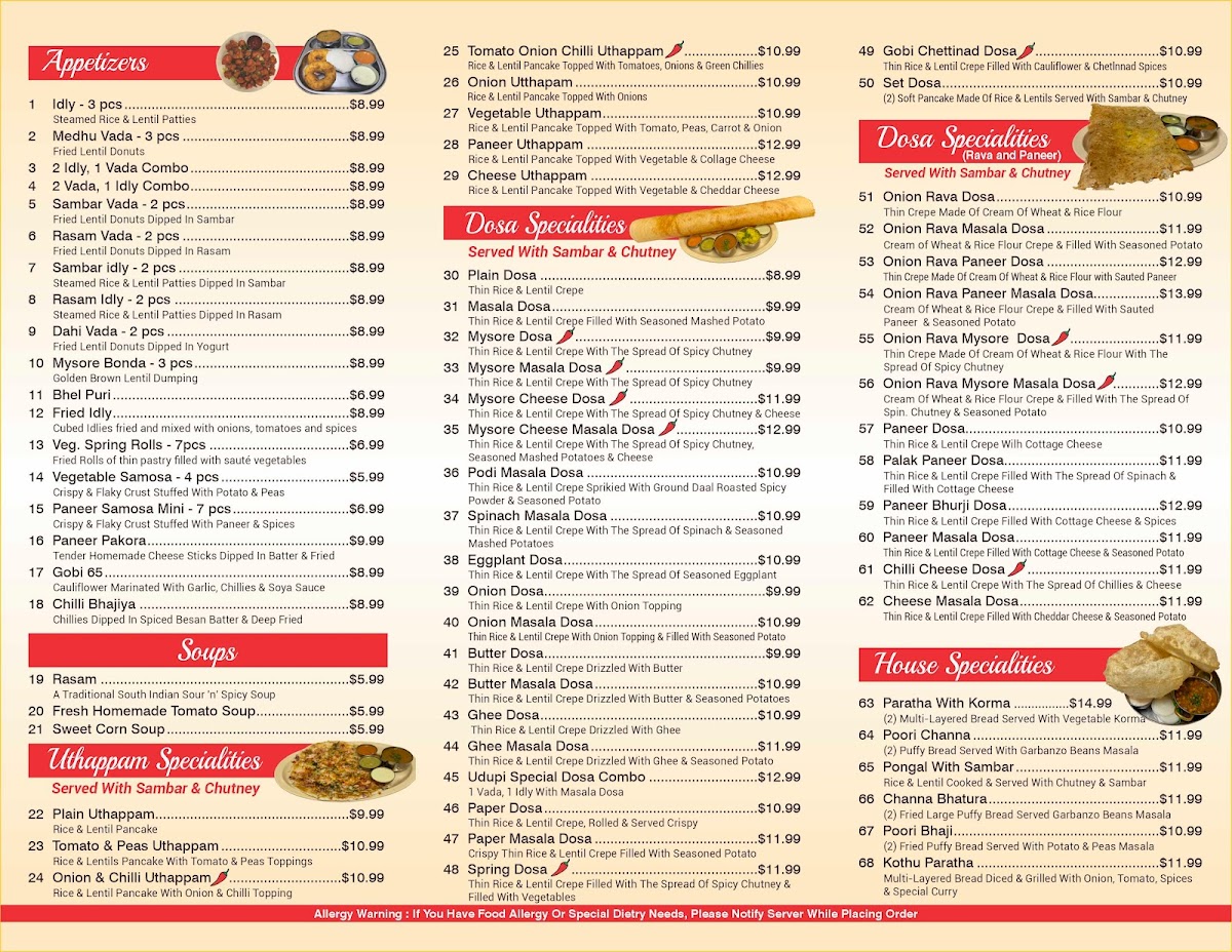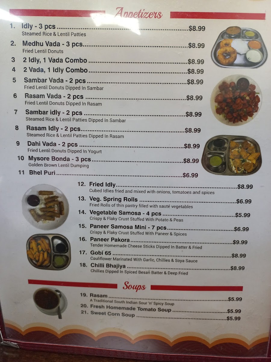 The menu offers a variety of South Indian specialties organized into several distinct categories to suit different dining preferences and occasions. For those looking for traditional breakfast and light meal options, the Appetizers section features steamed and fried items such as Idly, Medhu Vada, and combinations like 2 Idly & 1 Vada. Many items are served with accompaniments like sambar or rasam to enhance the experience.