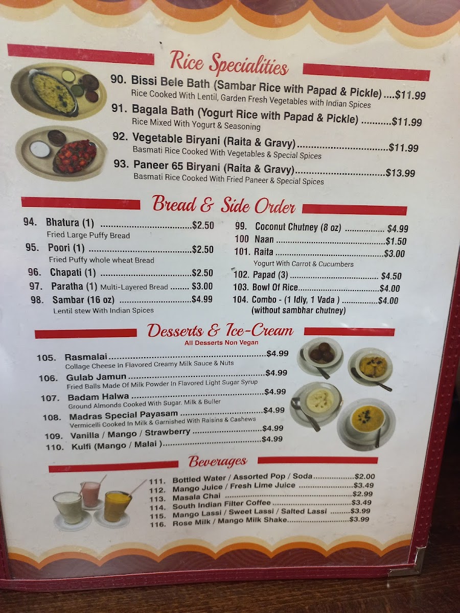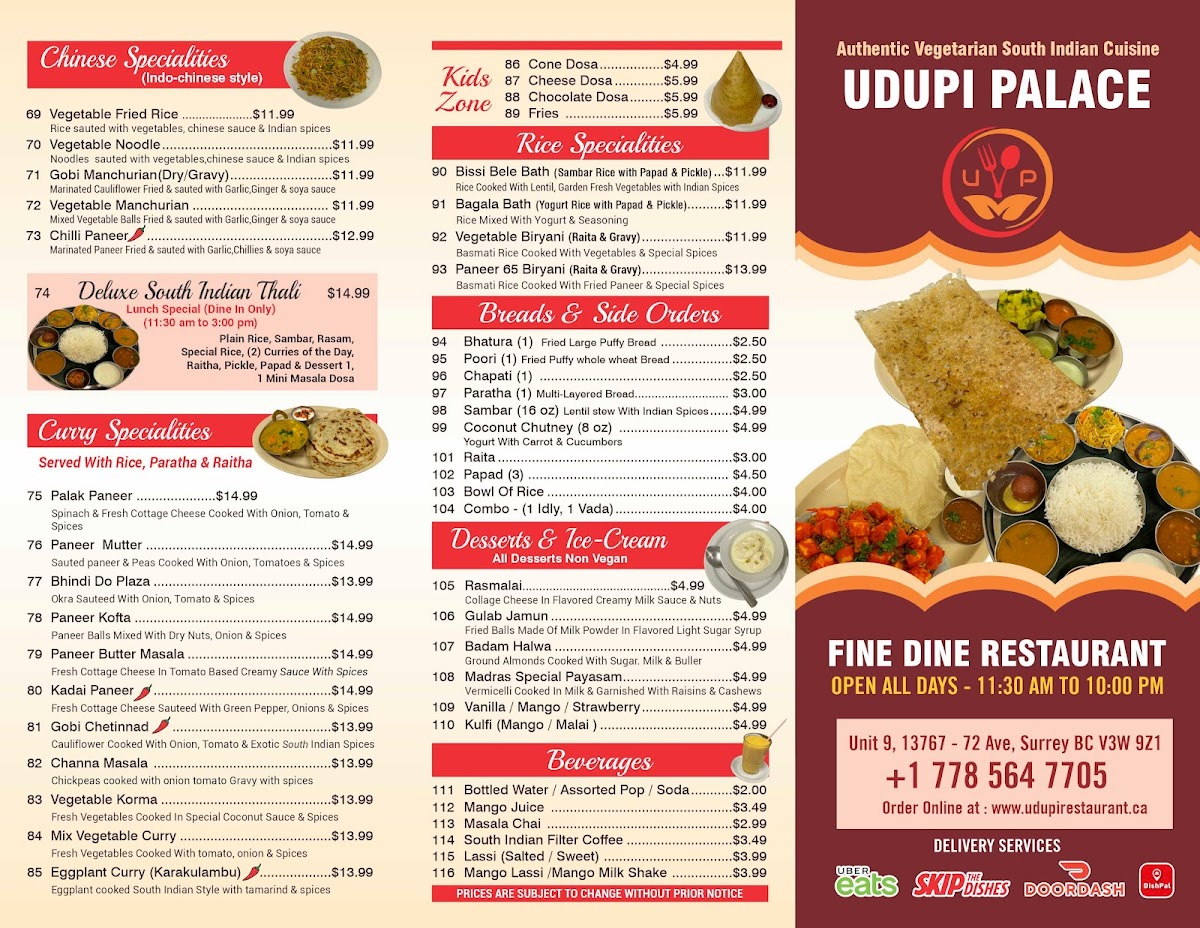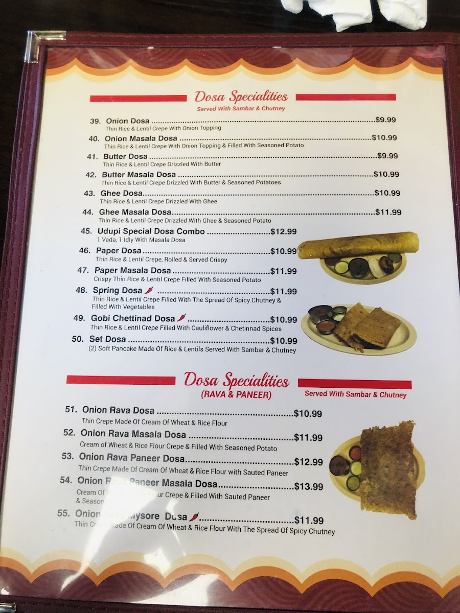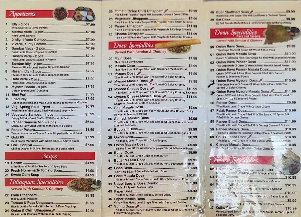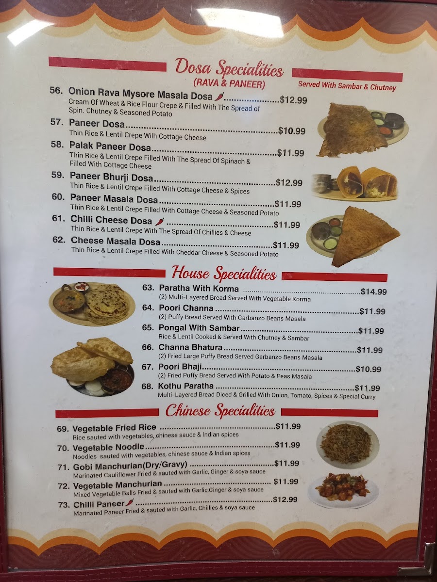 Additional menu highlights include popular South Indian mainstays such as Mysore Masala Dosa, Cheese Dosa, Deluxe South Indian Thali, Uttapam, and Channa Bhatura. There are also options like Gobi Manchurian, Gobi 65, and Kothu Paratha, which reflect a blend of traditional and Indo-Chinese flavors.